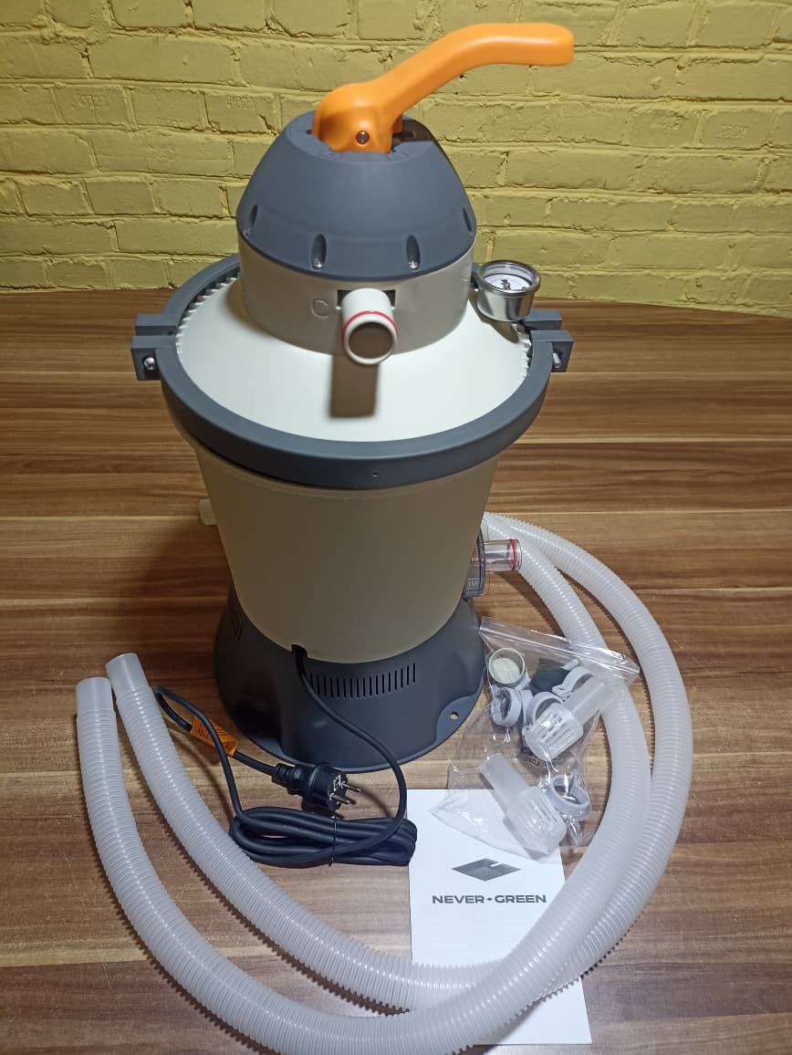 Песочный фильтр-насос NeverGreen предназначен для механической очистки воды в бассейне. В качестве фильтрующего элемента используется специальный кварцевый песок (0,45-0,85 мм). Фильтрующая установка комплектуется насосом, шестипозиционным клапаном переключения режимов работы, манометром для индикации давления в системе.