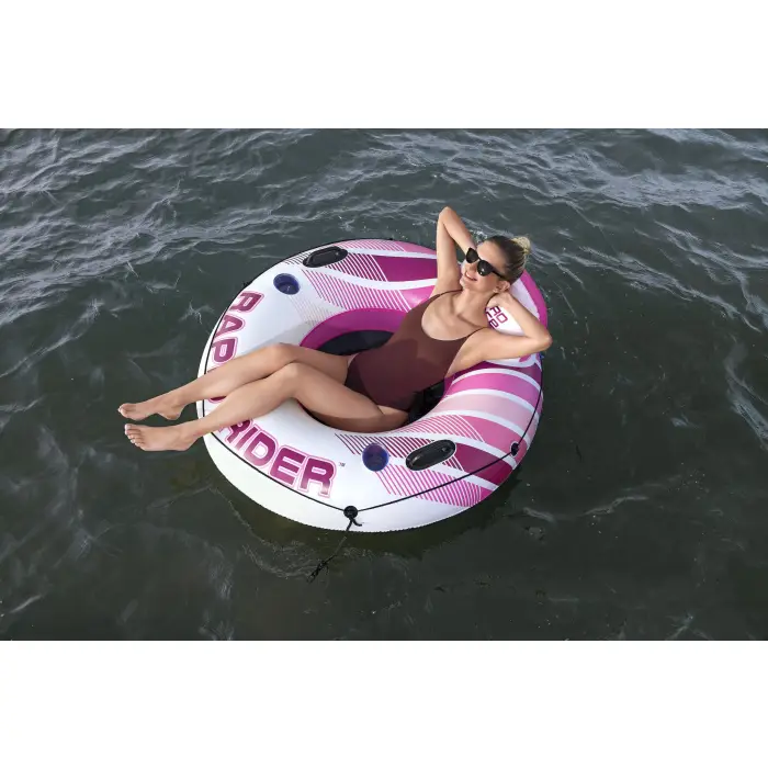 Износостойкий материал Inflata-Shield™ устойчив к растяжению и давлению воздуха. 2 пряжки Clasp 'N Go™ для соединения нескольких плавательных кругов. Премиальная конструкция со спинкой. Охлаждающее сетчатое сиденье. 2 подстаканника. Универсальный страховочный трос