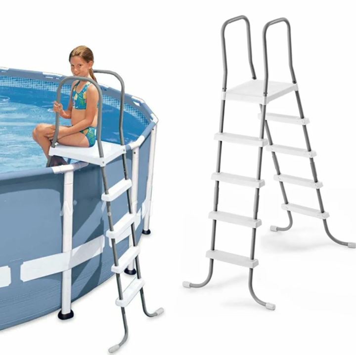 Лестница с площадкой для каркасных и надувных бассейнов INTEX с высотой борта 132 см. Легко и быстро устанавливается, имеет широкий угол между сторонами, достаточный для того чтобы не касаться стенок бассейна и в тоже время быть удобной в использовании.
