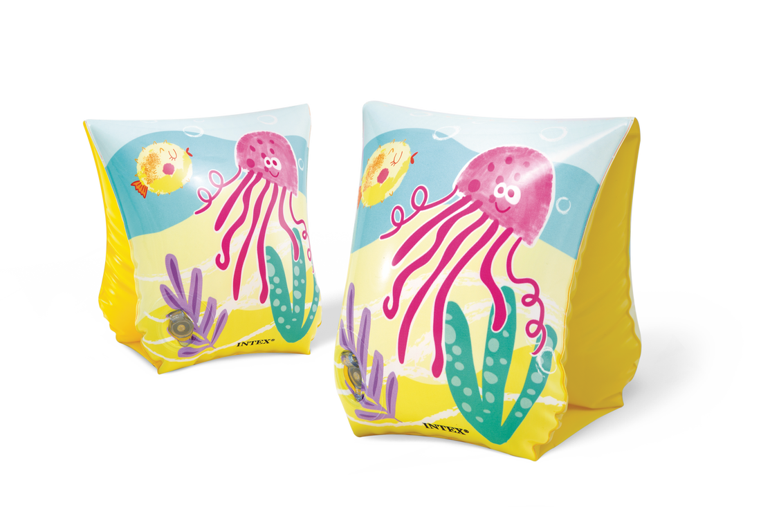 Нарукавники Подводный мир Intex 58652 предназначены для обучения плаванию и поддержке на воде. Имеют красочный яркий рисунок подводного мира. Подходят для детей от 3 до 6 лет. Изготовлены из высокопрочного винила толщиной 0,25 мм, абсолютно безопасного и прочного. Все внутренние швы изделия гладкие, не царапают кожу и не вызывают раздражения. Перед использованием нарукавник предварительно надувается и только потом надевается на руку. Сидят на руке комфортно, не прилипают, уже через 5 минут ребенок забывает про них и не ощущает их. Для малышей которые ещё не научились плавать, а также неуверенно держатся на воде, нарукавники будут отличным спутником при купании.