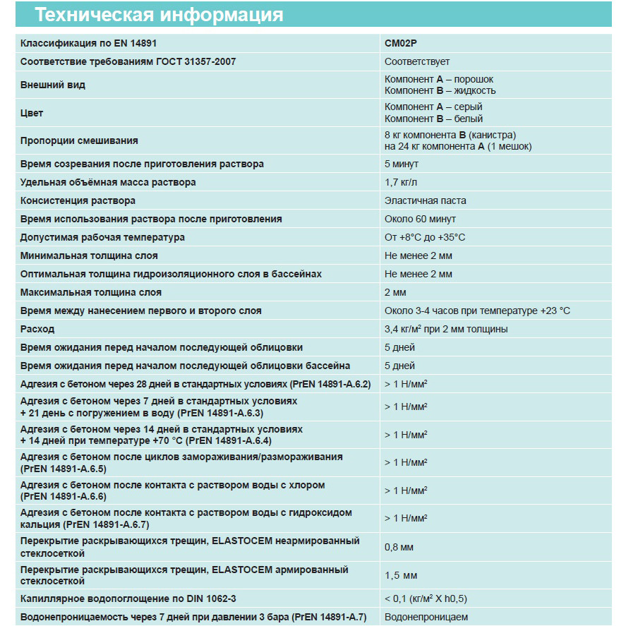 Вид состава: Гидроизоляция/добавки- Время созревания раствора: 5 минут;