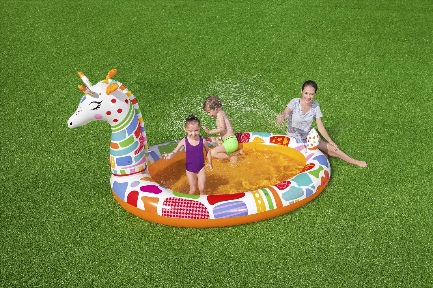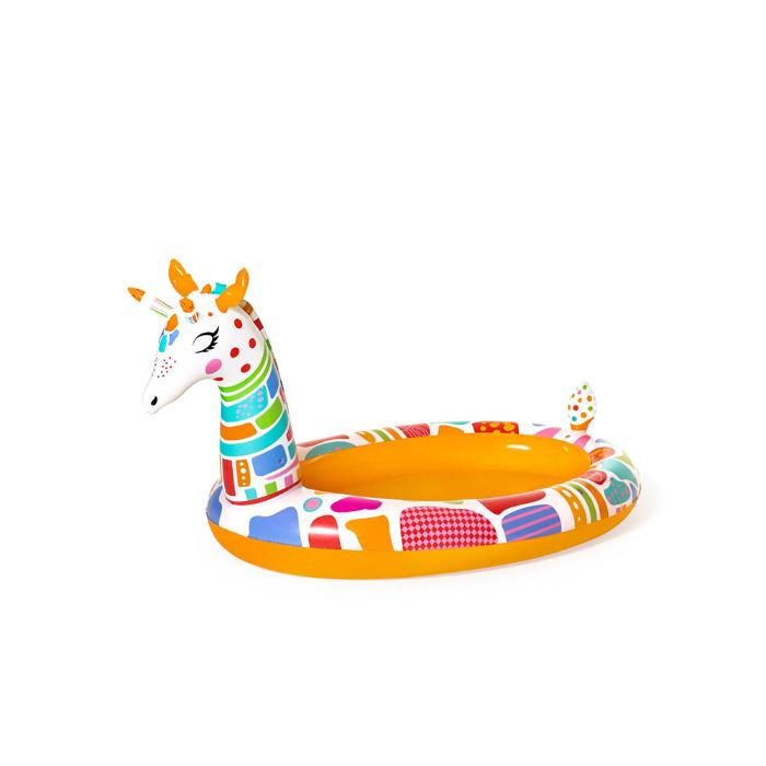 Необычайно яркий, разноцветный надувной бассейн с брызгалкой Веселый жираф от торговой марки Bestway - отличное решение для детей от 2 лет. Материал изготовления - высококачественный прочный винил. Для защиты предусмотрены мягкие надувные широкие бортики, чтобы ребёнок самостоятельно мог пользоваться без привлечения взрослых.