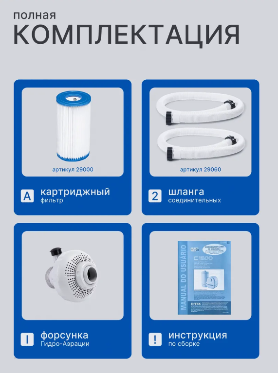 В комплекте идет фильтрующий картридж "А" и два гофрированных шланга, при помощи которых насос соединяется со штатными отверстиями бассейна.