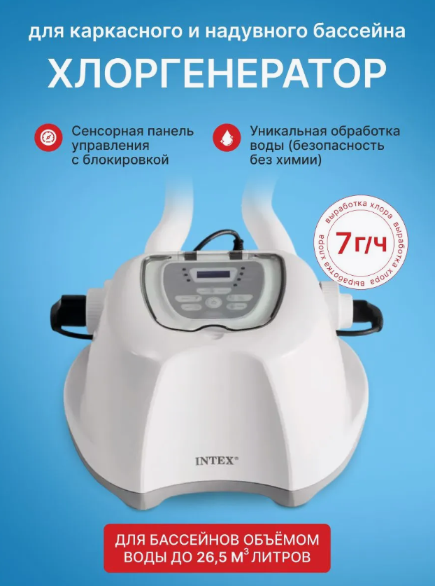 Хлорогенератор Krystal Clear Saltwater System Intex 26688 новая модель в компактном корпусе. Предназначен для обеззараживания воды и предотвращения ее цветения. Необходимая пропускная способность фильтра 2650-12112 л/час. Подходит для бассейнов до 32000 литров. В качестве реагента используется обычная поваренная соль, которую необходимо растворить в бассейне. Далее в процессе электролиза из нее выделяется свободный хлор, который не имеет запаха и не раздражает кожу или слизистую оболочку глаз. Система KRYSTAL CLEAR SALTWATER комбинирует в себе уникальную двухэтапную технологию для лучшего обеззараживания воды в бассейне. Когда Вы добавляете в воду обычную соль, за счет ее ионизации в хлоргенераторе (когда вода в процессе фильтрации проходит через покрытый титаном гальванический элемент) образуются ионы хлора. Эти ионы хлора совершенно безопасны для человека, совершенно им не ощущаются и в то же время являются смертельно губительными для различных микроорганизмов, которые заводятся и размножаются в любом открытом водоеме. В результате этого мы получаем новую, мягкую, очищенную воду без побочных химических элементов. С новым процессом ЭКО, молекулы воды расщепляются на очень мощные окислители, которые разрушают органические загрязнители, такие как бактерии и водоросли.